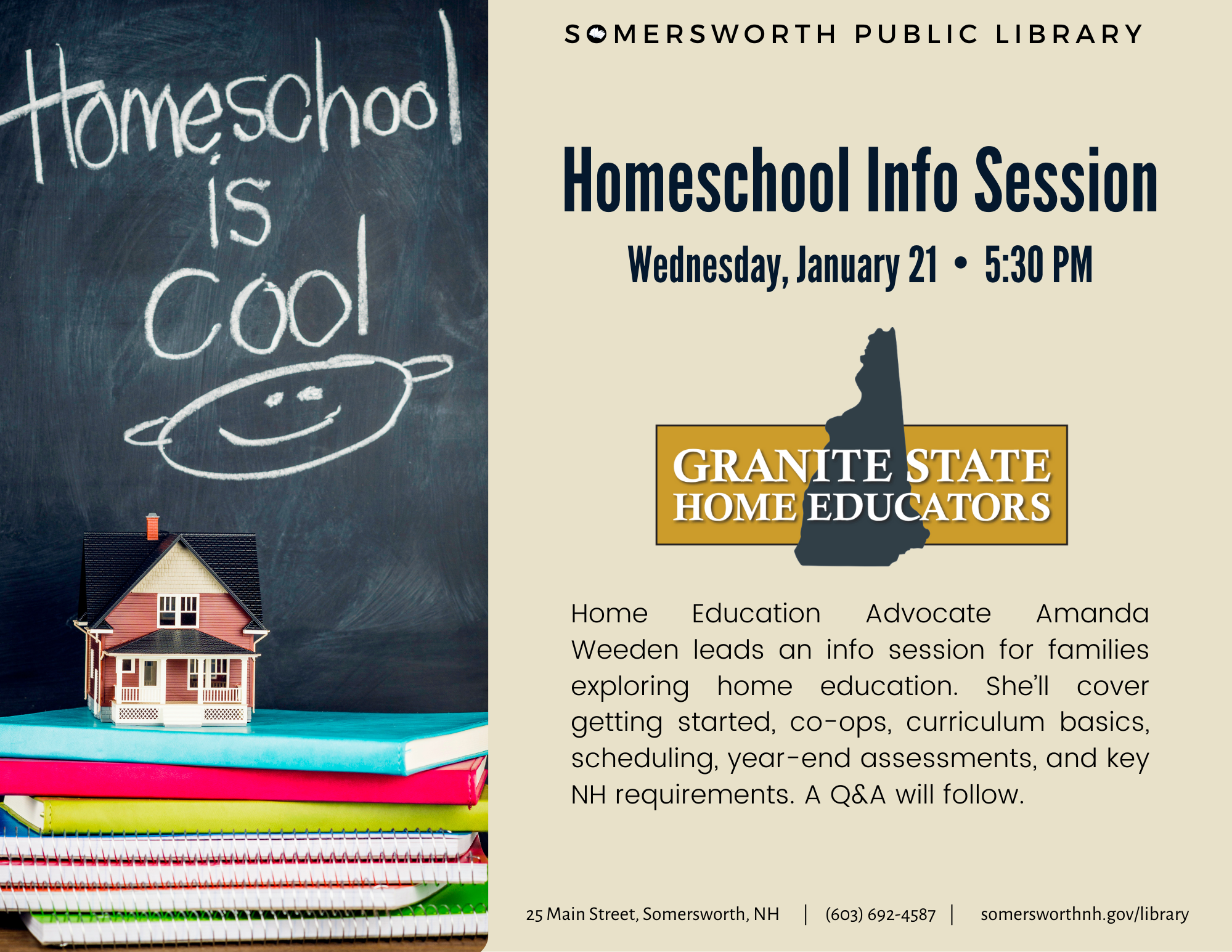 Homeschool Information Session + Add to Google Calendar + iCal / Outlook export Date Jan 21 2026 Expired! Time 5:30 pm - 7:30 pm Location Somersworth Public Library 25 Main St, Somersworth, NH Share this event