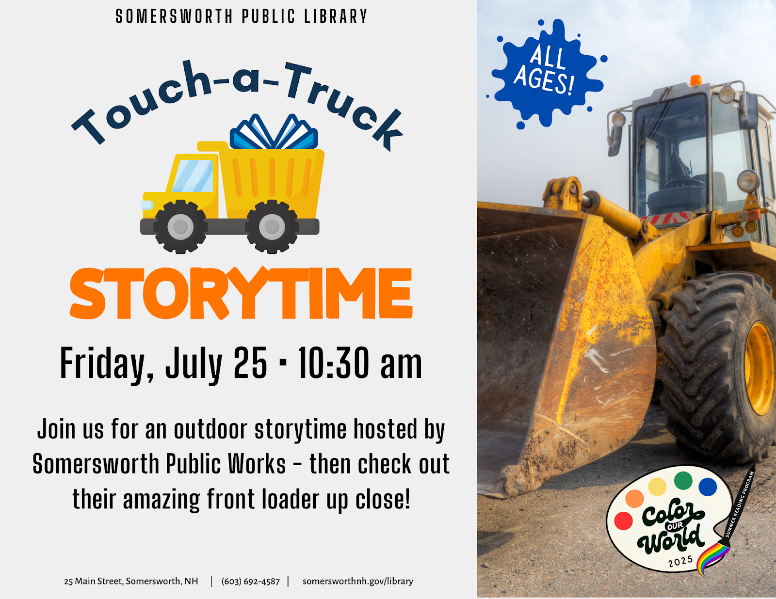 Join us for an outdoor storytime hosted by Somersworth Public Works – then check out their amazing front loader up close! All ages.
